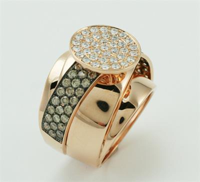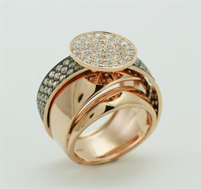 Anillo de oro rosa de 18 kilates con diamantes marrones de 1,25 quilates y dimantes blancos de 0,75 quilates, pureza VVS-VS, color GH, talla very good.
