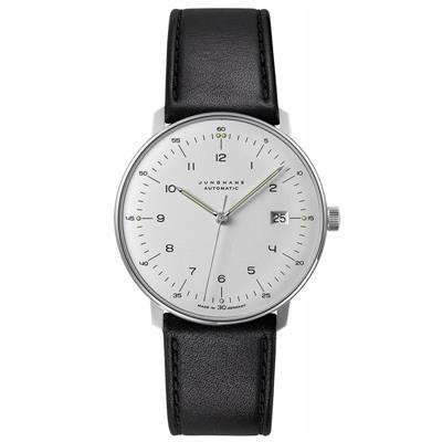 Reloj Junghans Max Bill Automatic, calibre J800.1. Reloj Automático con calendario. Caja de acero con cristal plexiglas duro convexo con recubrrimiento de Sicralán. Esfera blanca y piel negra.Como uno de los diseñadores más extraordinarios de este siglo, el arquitecto, escultor y diseñador de productos Max Bill, dejó tras de sí una amplia obra y, dentro de esta, una de las colecciones de relojes más fascinantes de las últimas décadas.